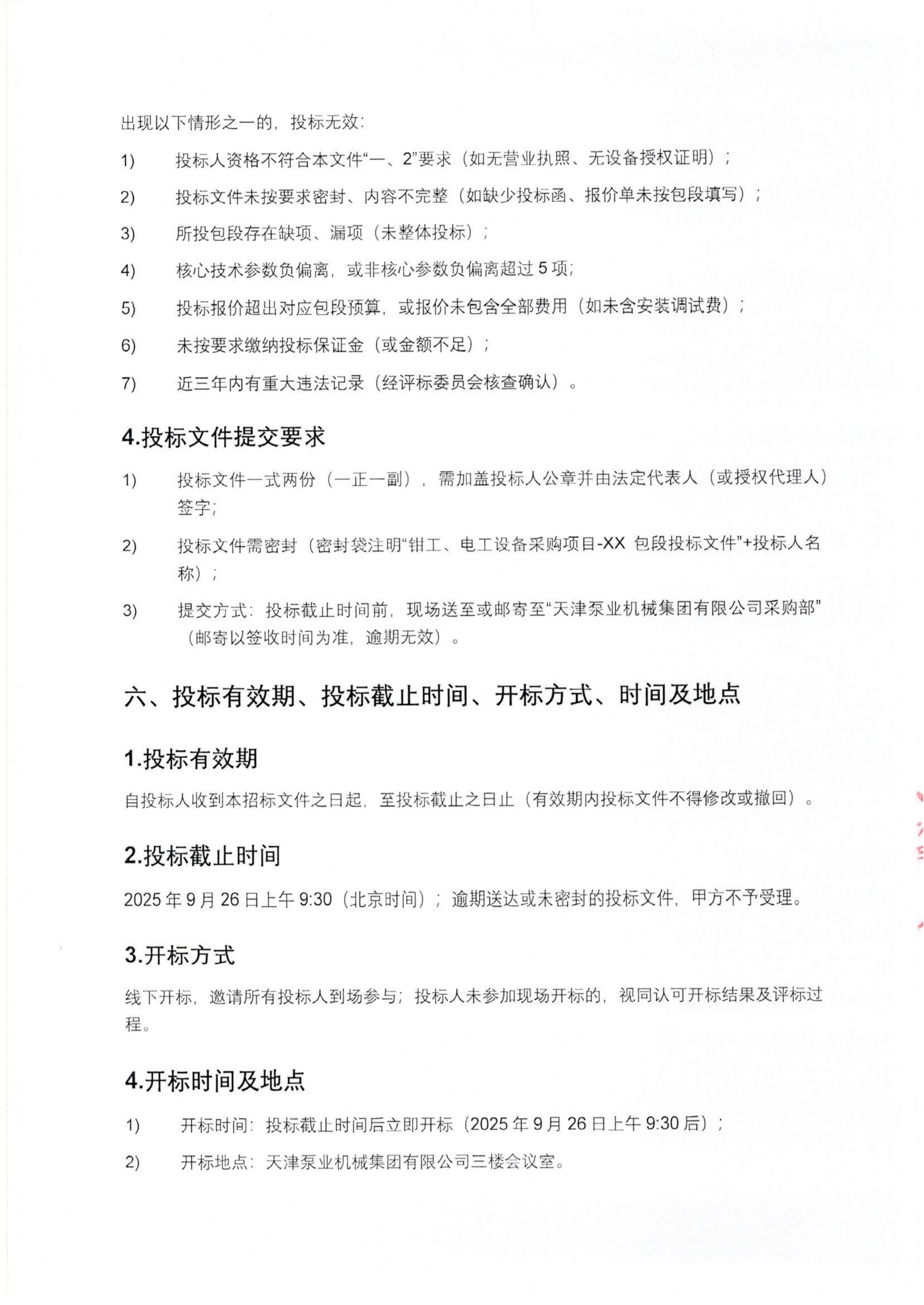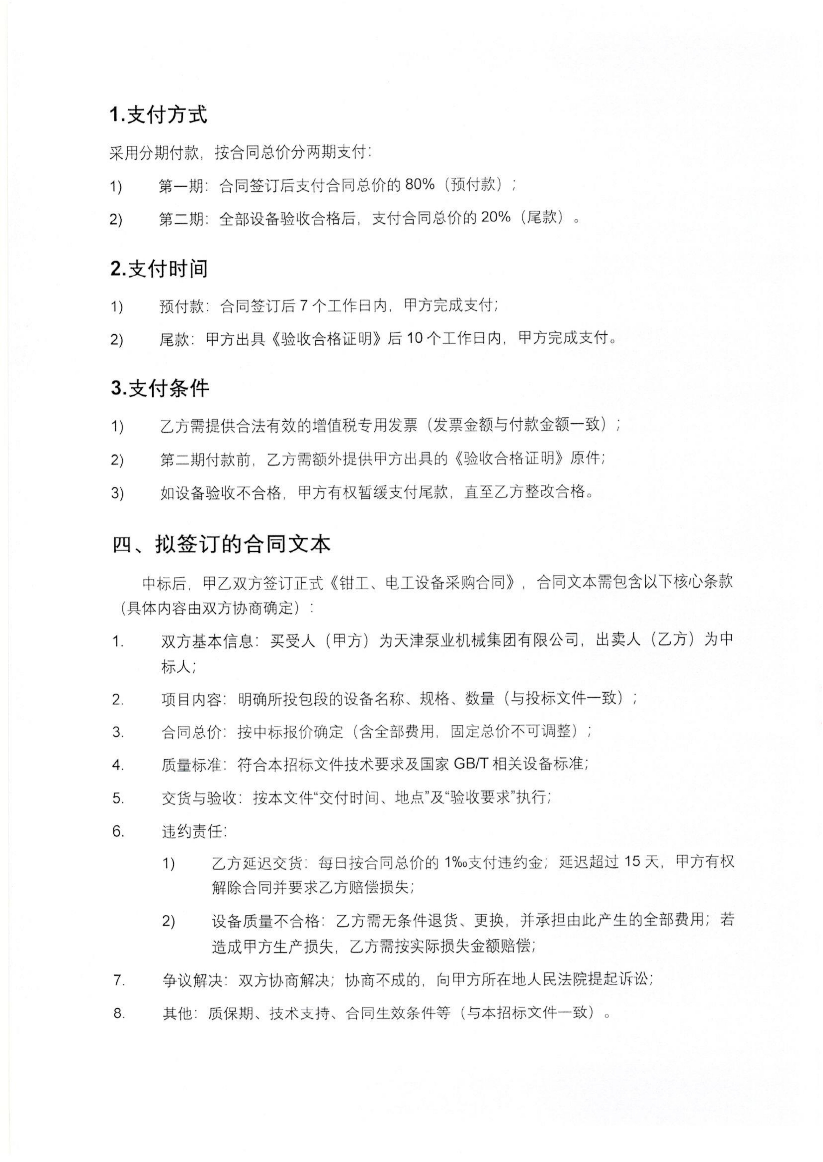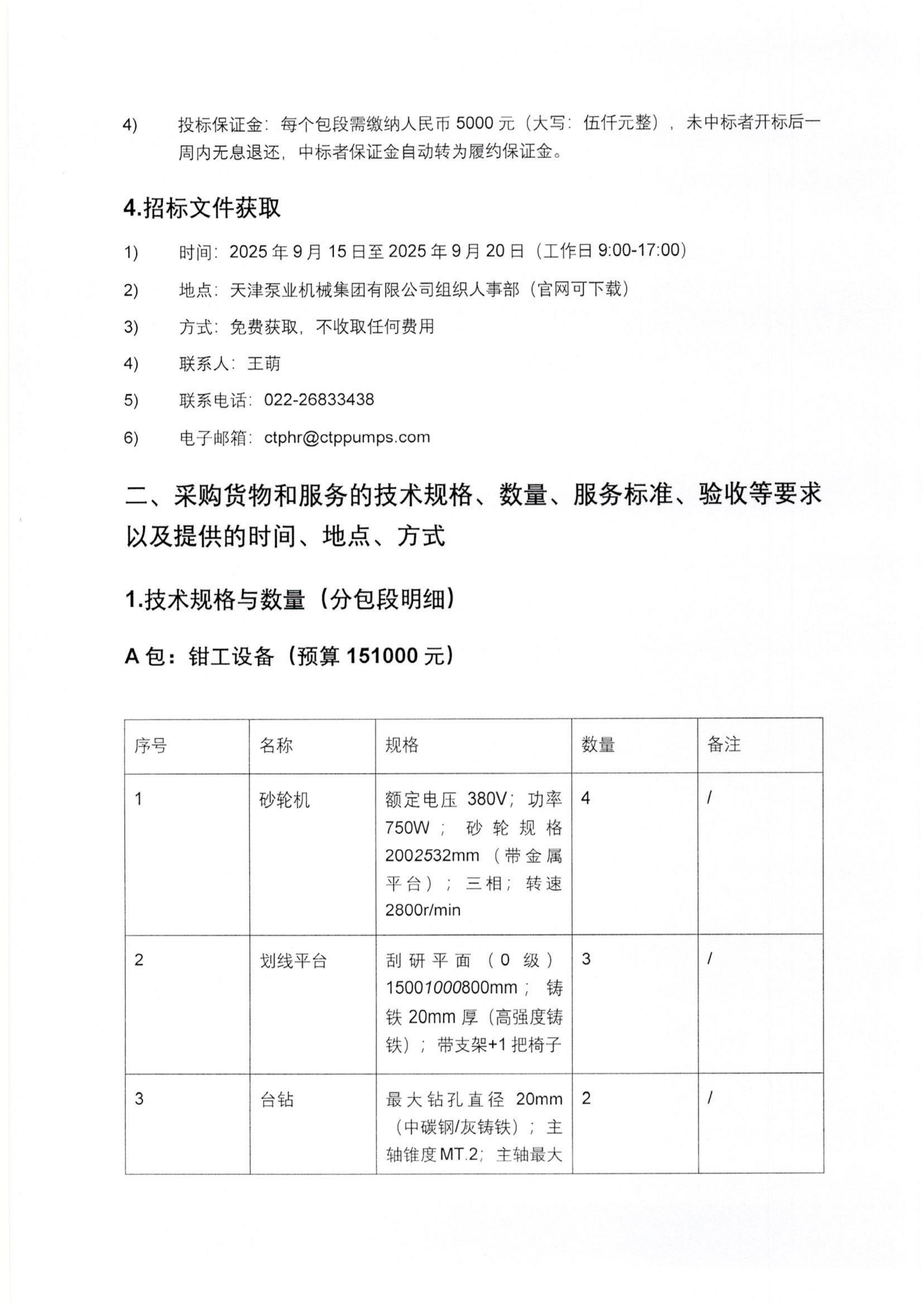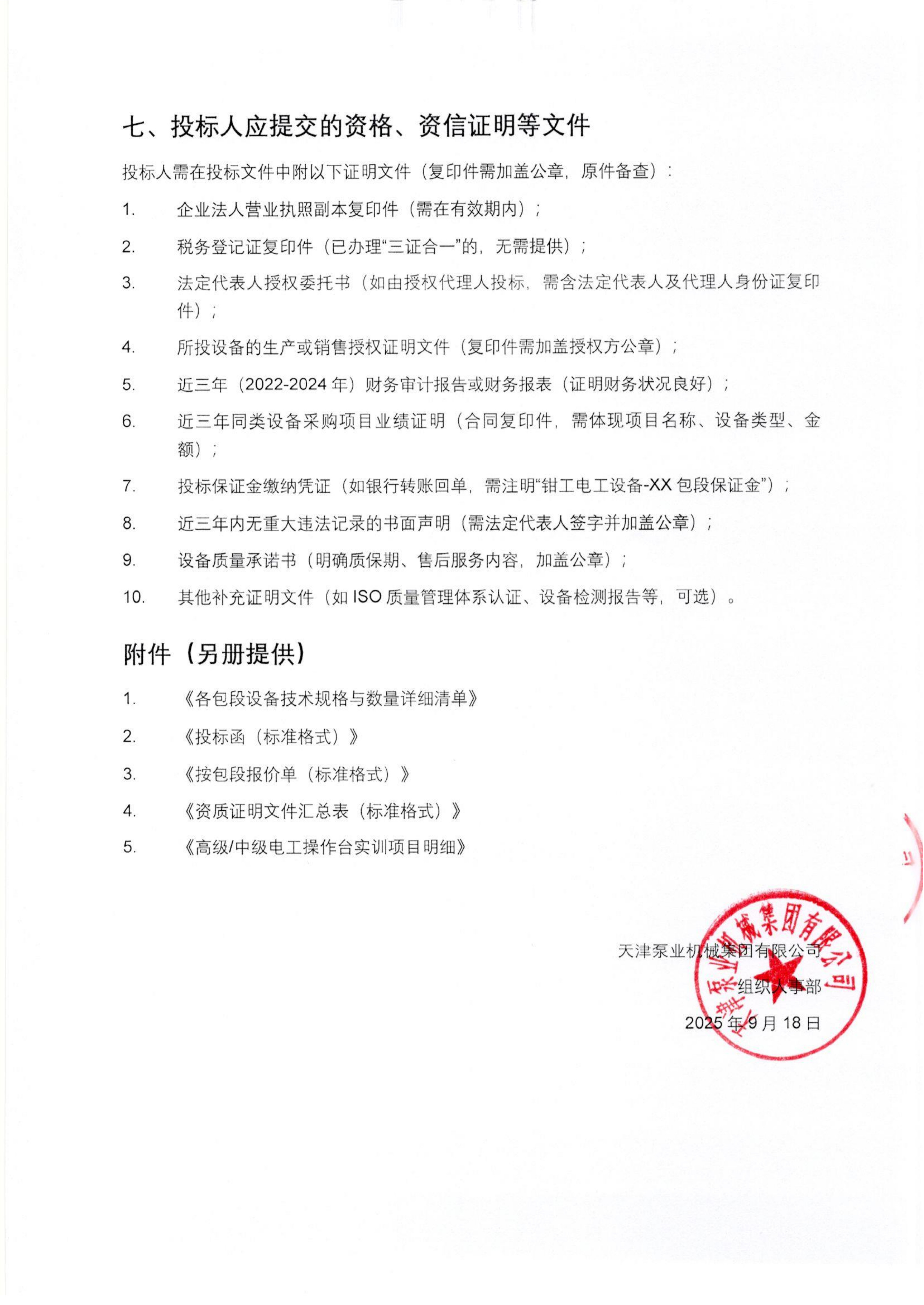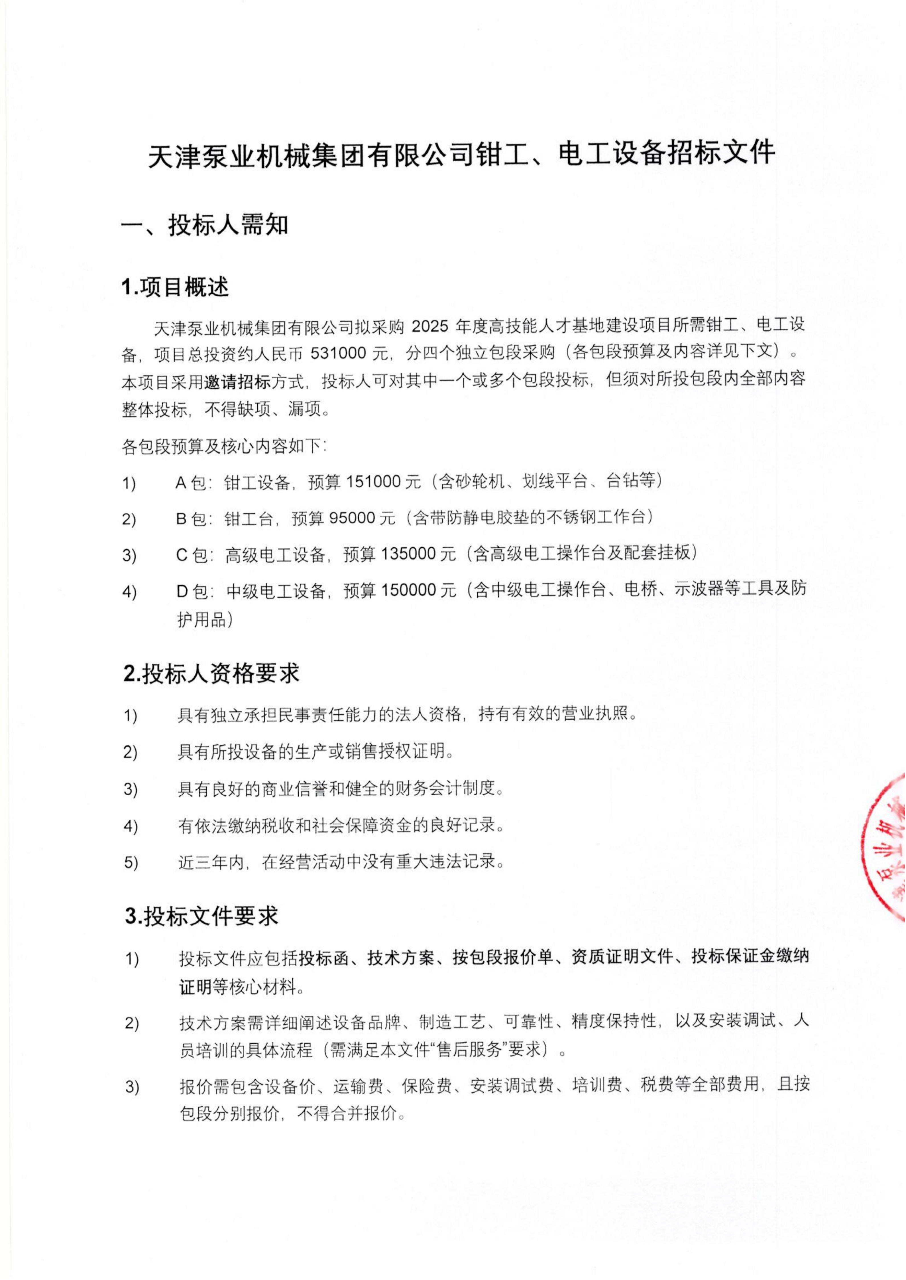 【概要描述】天津泵業(yè)機械集團有限公司擬采購 2025 年度高技能人才基地建設(shè)項目所需鉗工、電工設(shè)備,項目總投資約人民幣 531000 元,分四個獨立包段采購(各包段預(yù)算及內(nèi)容詳見下文)本項目采用邀請招標方式,投標人可對其中一個或多個包段投標,但須對所投包段內(nèi)全部內(nèi)容整體投標,不得缺項、漏項。